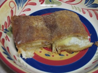 Preheat oven to 350F. Press 1 can of crescent rolls into bottom of 9 X 13 inch pan. Mix cream cheese, 1 cup sugar and vanilla until creamy. Spread over rolls in pan. Cover with other can of rolls. Melt butter and stir in rest of sugar and cinnamon. Pour over top. Bake for 30 minutes. Can be served warm in dish or room temperature cut into bars.